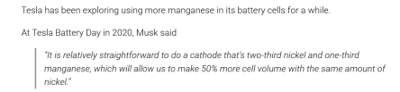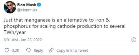中國(guó)儲(chǔ)能網(wǎng)訊:根據(jù)海外媒體inside EVS的消息,馬斯克稱(chēng)特斯拉一直在探索在電池中使用更多錳,并且認(rèn)為錳具有潛力。