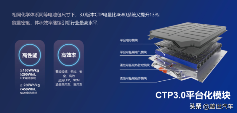 蓋世汽車最新獲悉,寧德時(shí)代通過(guò)不斷技術(shù)迭代,推出了第三代CTP技術(shù),內(nèi)部稱其為“麒麟電池”,該電池系統(tǒng)重量、能量密度及體積能量密度繼續(xù)引領(lǐng)行業(yè)最高水平。在相同的化學(xué)體系、同等電池包尺寸下,麒麟電池包的電量,相比4680系統(tǒng)可以提升13%。
