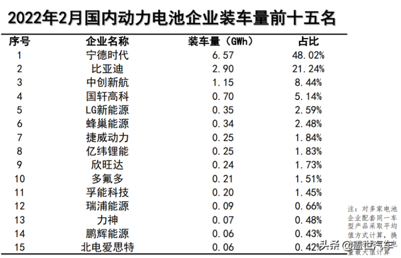 值得注意的是,在2月裝車量排名前十的企業(yè)當(dāng)中,寧德時(shí)代的裝車量為6.57GWh(超過(guò)其他9家的總和),市場(chǎng)占有率48%,雖仍居國(guó)內(nèi)動(dòng)力電池企業(yè)裝車量TOP1,但是其2月市場(chǎng)份額占比較1月(份額為50.2%)已有所下降,而在其后的比亞迪、中創(chuàng)新航,市場(chǎng)份額均有所上升。
