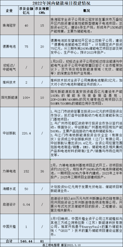 除大額訂單簽約落地,眾多企業(yè)也將目光鎖定在了投擴建儲能賽道上。據(jù)高工鋰電不完全統(tǒng)計,開年以來,國內(nèi)投擴建儲能項目涉及金額達540.44億元,涉及規(guī)模超81GWh。