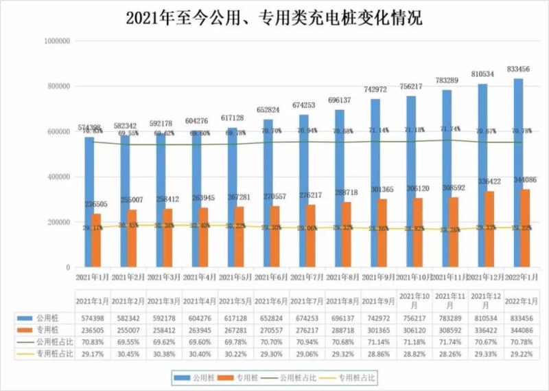 截至2022年1月,我國公用類充電樁數(shù)量為83萬臺(tái),專用類充電樁為34萬臺(tái),目前依然以公用類充電樁為主,占比為70%,公用類充電樁與專用類充電樁的比值長期穩(wěn)定在7:3。