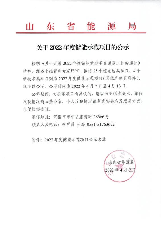 根據(jù)《關(guān)于開展2022年度儲能示范項目遴選工作的通知》精神,經(jīng)各市推薦和專家評審,擬將25個鋰電池類項目、4個新技術(shù)類項目列為2022年度儲能示范項目(具體名單見附件),現(xiàn)予以公示。公示時間為2022年4月7日至4月13日。