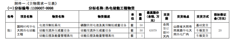 據(jù)了解,大同熱電儲能項(xiàng)目招標(biāo)人為國網(wǎng)時(shí)代(大同)儲能發(fā)展有限公司,采購內(nèi)容包括50套磷酸鐵鋰電池及預(yù)制艙成套設(shè)備、50套儲能變流升壓成套設(shè)備以及1套儲能監(jiān)控及能量管理系統(tǒng)。