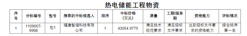 中國儲能網(wǎng)訊:4月9日,國網(wǎng)時(shí)代華電大同熱電儲能工程儲能設(shè)備采購中標(biāo)結(jié)果出爐,福建智儲科技有限公司投標(biāo)報(bào)價(jià)43054.9775萬元獲得中標(biāo)。該儲能項(xiàng)目儲能規(guī)模150MW/300MWh,則中標(biāo)單價(jià)1.435元/Wh。
