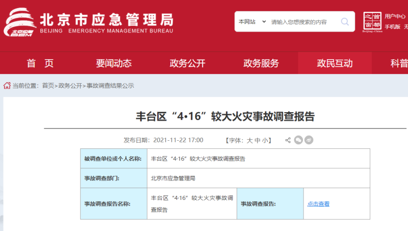 2021年11月22日,北京市應(yīng)急管理局發(fā)布事故調(diào)查報告,全文如下: