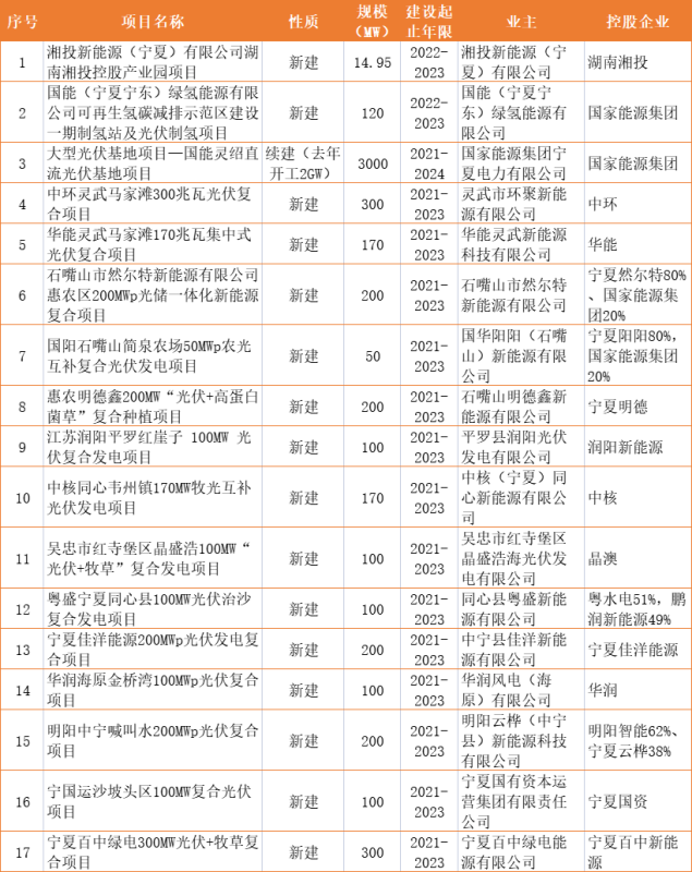 在光伏電站項目方面,17個項目包括3個重點項目、14個2022年光伏競爭性配置項目。根據(jù)業(yè)主梳理情況來看,國家能源集團規(guī)模超過1GW,中環(huán)、寧夏百中新能源各300MW。
