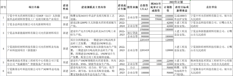 在重點制造業(yè)方面,中環(huán)在寧夏續(xù)建的50GW單晶硅片項目(G12),預計今年完成1000臺單晶爐的安裝,東方希望的12.5萬噸多晶硅新建產能、潤陽新能源5萬噸多晶硅產能、株洲中車的10GW逆變器項目、寧夏金晶科技的1200噸/天太陽能光伏輕質面板生產線、寧夏隆基的3GW單晶電池項目。