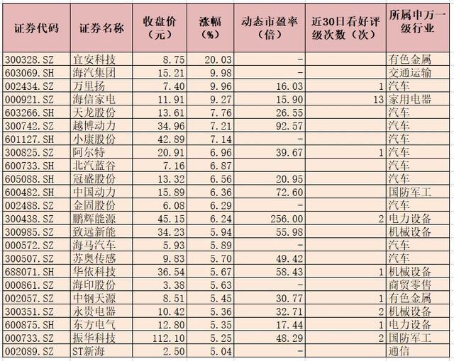 表:4月12日漲幅超5%的新能源汽車概念股一覽