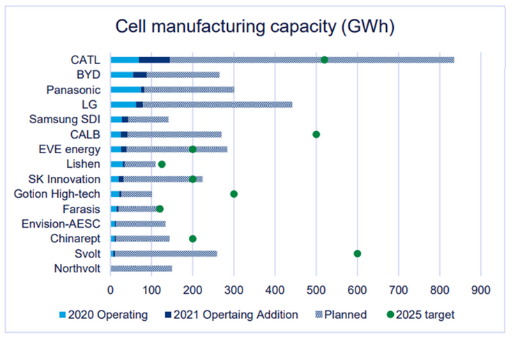 在2021年全球產(chǎn)能排名前15位的廠商共生產(chǎn)約200GWh的電池,累計產(chǎn)能達(dá)到600GWh。與此同時,還有3,000GWh的電池產(chǎn)能處于規(guī)劃或建設(shè)階段。例如寧德時代公司以出色的運營和計劃產(chǎn)能引領(lǐng)生產(chǎn)規(guī)模增長,到2030年該公司的產(chǎn)能達(dá)到800GWh。還有一些中國電池制造商也制定了雄心勃勃的2025年產(chǎn)能目標(biāo)。Wood Mackenzie公司預(yù)計2022年將會開通更多新工廠。