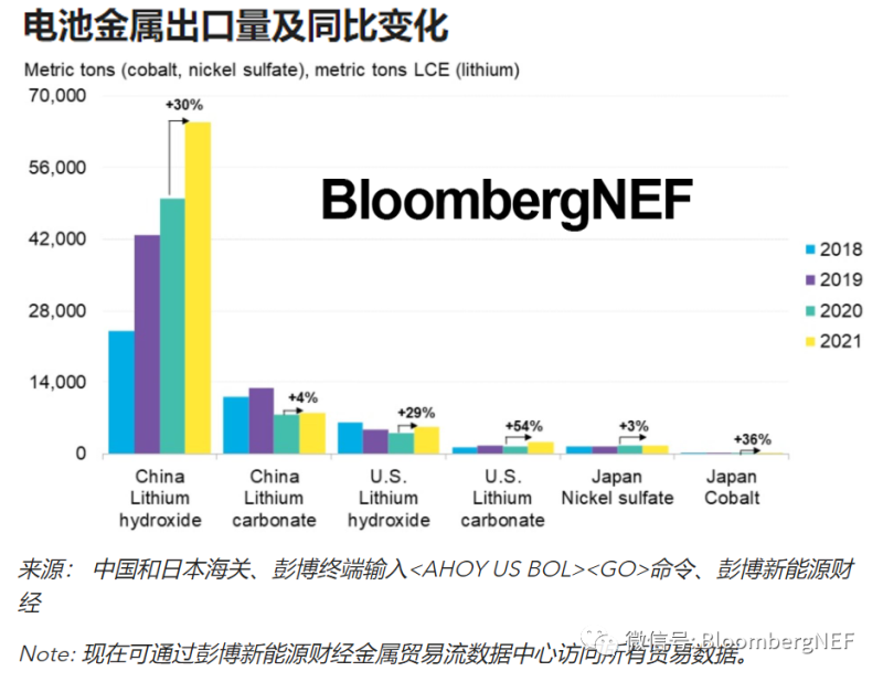 2021年鋰出口激增。中國(guó)氫氧化鋰出口同比增長(zhǎng)30%,而碳酸鋰出口量同比增長(zhǎng)4%,從2020年大幅下降41%中反彈。