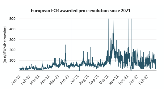 (2)頻率調(diào)節(jié)市場由一次性承諾組成的,即在一年中的任何一天的特定時間段內(nèi)遵循電網(wǎng)系統(tǒng)的操作指令(頻率遏制服務(wù)的持續(xù)時間為四個小時,自動頻率恢復(fù)儲備服務(wù)的持續(xù)時間為1小時)。相關(guān)收入通過管理平臺上的拍賣系統(tǒng)確定。因此,已經(jīng)承諾進(jìn)入容量市場的儲能系統(tǒng)能夠在提供這些服務(wù)的時間之外進(jìn)行投標(biāo)。在2021年1月至2022年2月期間,頻率遏制服務(wù)的價(jià)格變化很大,4小時的可用性從100歐元/MW到1,600歐元/MW不等。