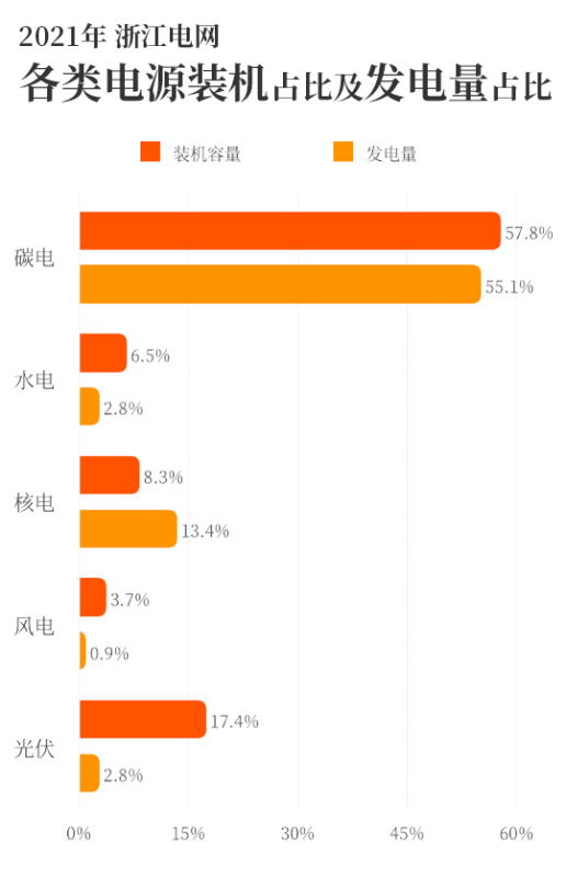 截至目前,“碳電”仍扮演主力電源的角色。至2021年底,浙江電網(wǎng)“碳電”裝機(jī)6330萬(wàn)千瓦,占全口徑裝機(jī)容量的57.8%,全年消費(fèi)“碳電”3035億千瓦時(shí)(不含省外送入),占全社會(huì)用電量的55.1%。