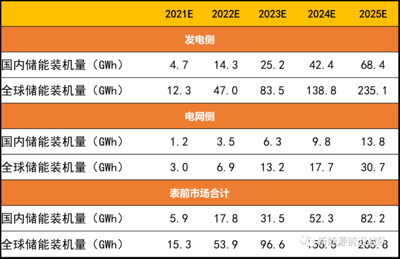 基于我們前文對國內發(fā)電側、電網側儲能裝機量預測,以及此前我們對海外表前市場的裝機量預測,我們預計: