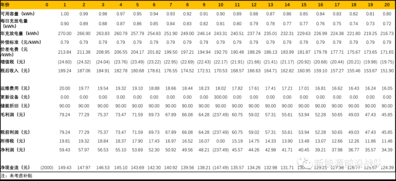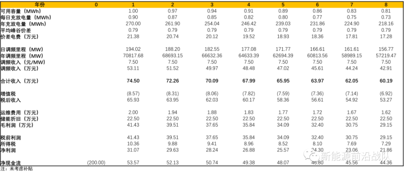 儲能項目:建設成本、循環(huán)壽命與前文假設相同;由于同時參與調峰+調頻需要更高頻的充放電,因此年衰減將達到3%,對應全生命周期縮小為8年;