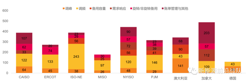 圖:調頻和調峰是國外電池儲能的主要應用場景(美元/kW/年)