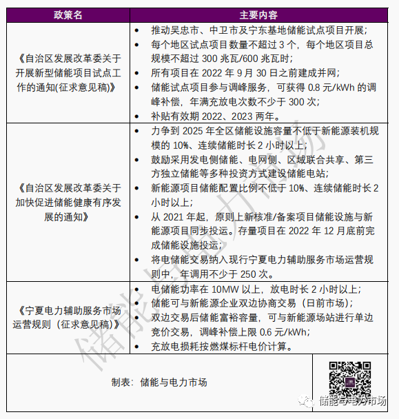 相對于躍躍欲試的項目方,寧夏目前的儲能政策支持力度還較為薄弱。2021年11月、7月、3月寧夏曾分別出臺過《自治區(qū)發(fā)展改革委關(guān)于開展新型儲能項目試點工作的通知(征求意見稿)》、《自治區(qū)發(fā)展改革委關(guān)于加快促進(jìn)儲能健康有序發(fā)展的通知》、《寧夏電力輔助服務(wù)市場運營規(guī)則(征求意見稿)》,是主要可參考的文件。