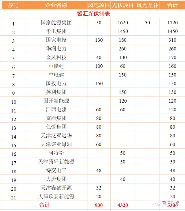 表:天津2021~2022年風(fēng)電、光伏新增項(xiàng)目的投資企業(yè)分布(單位:MW)