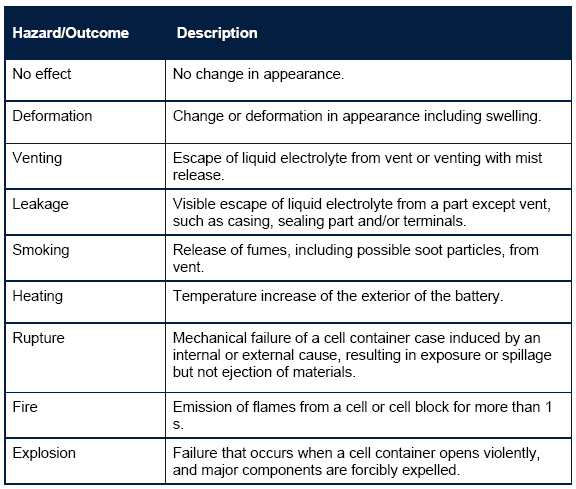 盡管人們非常關注火災和爆炸等故障的破壞后果,但鋰離子電池故障期間還有其他幾種潛在后果,如變形、破裂、泄漏、加熱、通風、吸煙、火災(起火)、爆炸等。這些結果也可能構成危險,隨著時間的推移,尤其是大型電池儲能系統(tǒng)可能會導致更大的危險。《采用電動道路車輛二次鋰離子電池第2部分:可靠性和濫用試驗》IEC 62660-2標準中列出了對電池濫用試驗不同結果的定義,如表4所示。其潛在的結果是相互關聯(lián)的,在故障期間可能會出現(xiàn)幾種結果。
