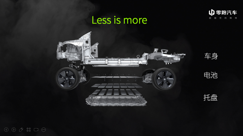 零跑科技電池產(chǎn)品線總經(jīng)理宋憶寧在這次發(fā)布會上分享道:“零跑智能動力CTC技術(shù),即cell -to -chassis,是指將電池、底盤和下車身進(jìn)行集成設(shè)計,簡化產(chǎn)品設(shè)計和生產(chǎn)工藝的前沿技術(shù)。通過重新設(shè)計電池承載托盤,使整個下車體底盤結(jié)構(gòu)與電池托盤結(jié)構(gòu)耦合,創(chuàng)新了安裝工藝,真正做到了Less is more。通過減少冗余的結(jié)構(gòu)設(shè)計,能有效減少零部件數(shù)量,在提升空間利用率和系統(tǒng)比能的同時,讓車身與電池結(jié)構(gòu)互補(bǔ),使電池抗沖擊能力及車身扭轉(zhuǎn)剛度得到大幅度提升?!?
