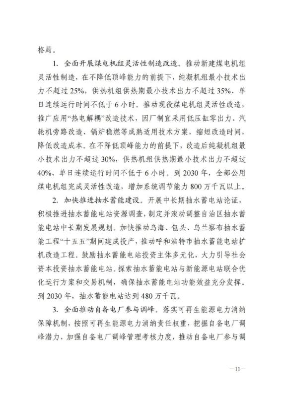 到 2030 年,太陽能熱發(fā)電裝機(jī)規(guī)模達(dá)300萬千瓦左右。抽水蓄能電站達(dá)到480萬千瓦。新型儲能裝機(jī)規(guī)模達(dá)到2500萬千瓦。 通道可再生能源外送電量占比超過50%。全部公用煤電機(jī)組完成靈活性改造,增加系統(tǒng)調(diào)節(jié)能力800萬千瓦以上。全部自備電廠均參與電力系統(tǒng)調(diào)峰,釋放調(diào)節(jié)能力700萬千瓦以上。到2030年,蒙西電力市場具備與國家市場聯(lián)合運行條件,新能源全面參與市場交易,市場主體平等競爭、自主選擇,電力資源得到優(yōu)化配置。