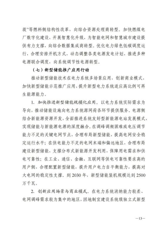 1、加快推進(jìn)新型儲能規(guī)?;瘧?yīng)用。以電力系統(tǒng)實際需求為導(dǎo)向,推動儲能設(shè)施向電力系統(tǒng)源網(wǎng)荷各環(huán)節(jié)提供服務(wù)。電源側(cè)結(jié)合新能源資源開發(fā),全面推進(jìn)系統(tǒng)友好型新能源電站發(fā)展模式,實現(xiàn)儲能與新能源電源的深度融合。在調(diào)峰調(diào)頻困難或電壓調(diào)節(jié)能力不足的關(guān)鍵電網(wǎng)節(jié)點,合理布局新型儲能,提高電網(wǎng)安全穩(wěn)定運行水平;在供電能力不足的電網(wǎng)末端和偏遠(yuǎn)地區(qū),合理布局建設(shè)新型儲能,支撐分布式新能源開發(fā)利用,保障用電需求和供電可靠性;在工業(yè)、通信、金融、互聯(lián)網(wǎng)等供電可靠性要求高的用戶側(cè),合理配置新型儲能,提升用戶電力自平衡能力,提高對大電網(wǎng)的穩(wěn)定性支撐。到2030年,新型儲能裝機(jī)規(guī)模達(dá)到 2500萬千瓦。