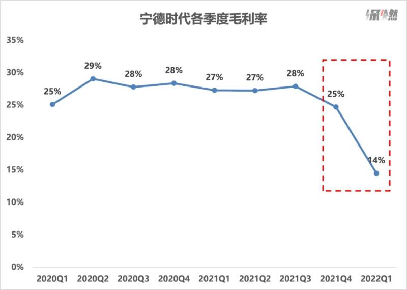 這也非常直觀地體現(xiàn)在了毛利率的變化中。在寧德時代的成本構(gòu)成中,直接材料的占比超過 75%。過去兩年來,寧德時代每個季度的毛利率,都維持在25%以上,但是今年一季度,直接降到了14%。