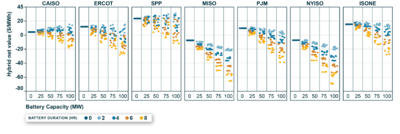 在獲得聯(lián)邦投資稅收抵免(ITC)這個最具吸引力的混合部署項(xiàng)目配置中,電池儲能系統(tǒng)的持續(xù)時間往往是2到4小時,配套的電池儲能系統(tǒng)的裝機(jī)容量為太陽能發(fā)電設(shè)施或風(fēng)力發(fā)電設(shè)施裝機(jī)容量的25%或100%,具體取決于地區(qū)(如圖7所示)。設(shè)置電網(wǎng)互連容量以允許可再生能源發(fā)電設(shè)施和儲能系統(tǒng)同時放電,將產(chǎn)生比將互連規(guī)模限制為僅太陽能發(fā)電設(shè)施或風(fēng)力發(fā)電設(shè)施裝機(jī)容量更高的混合凈值。