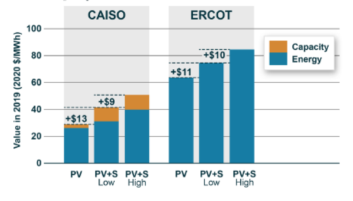 為了查看圖4中顯示的電力采購協(xié)議(PPA)的價格加法器是否有意義,伯克利實(shí)驗(yàn)室對加州獨(dú)立系統(tǒng)運(yùn)營商(CAISO)和德州電力可靠性委員會(ERCOT)的獨(dú)立部署太陽能發(fā)電設(shè)施配套電池儲能系統(tǒng)的價值進(jìn)行了建模,電池儲能系統(tǒng)的裝機(jī)容量為太陽能發(fā)電設(shè)施裝機(jī)容量的一半,持續(xù)時間4小時(如圖5所示)。這種配置應(yīng)該使電力采購協(xié)議(PPA)價格增加8~13美元/MWh。當(dāng)然,在電力采購協(xié)議(PPA)的整個生命周期內(nèi),混合部署項(xiàng)目的價值會有所不同,但至少在最近幾年,并且在聯(lián)邦投資稅收抵免(ITC)的幫助下,增加的增值似乎證明價格溢價是合理的。