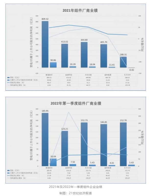 21世紀(jì)經(jīng)濟(jì)報(bào)道新能源課題組統(tǒng)計(jì)了75家A股光伏公司業(yè)績,2021年,這些企業(yè)合計(jì)實(shí)現(xiàn)營業(yè)收入8218.05億元,較2020年同比增長39.42%;實(shí)現(xiàn)歸屬于上市公司股東的凈利潤為721.13億元,較2020年同比增長69.81%。今年一季度,75家A股光伏公司合計(jì)實(shí)現(xiàn)營業(yè)收入2451.34億元,較2021年一季度同比增長57.81%;實(shí)現(xiàn)歸屬于上市公司股東的凈利潤為297.87億元,較2021年一季度同比增長95.51%。