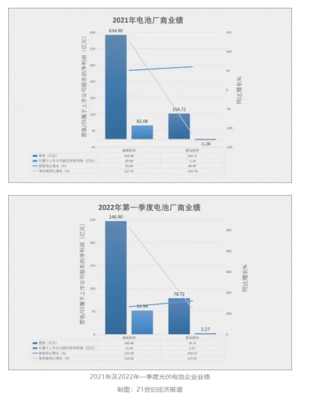2021年,兩家主力光伏電池公司通威股份、愛旭股份電池業(yè)務(wù)分別實(shí)現(xiàn)營業(yè)收入超過240億元、153億元,在銷售量增長的推動下,銷售額雙雙提升。然而,兩家電池龍頭共同面臨的處境是,毛利率均出現(xiàn)嚴(yán)重下滑——通威股份電池業(yè)務(wù)毛利率為8.81%,較2020年減少5.73個百分點(diǎn);愛旭股份電池業(yè)務(wù)毛利率為5.43%,較2020年減少9.07個百分點(diǎn)。