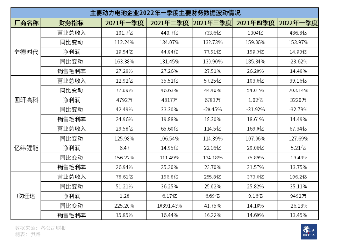 營(yíng)收方面,2022年第一季度,主要?jiǎng)恿﹄姵仄髽I(yè)依然保持了高增速,寧德時(shí)代、國(guó)軒高科、億緯鋰能增速均在一倍以上,欣旺達(dá)的增速僅有三成主要是由于業(yè)務(wù)中車用動(dòng)力電池的占比還不高,根據(jù)2021年財(cái)報(bào),動(dòng)力電池僅占欣旺達(dá)營(yíng)收的7.85%,單純看動(dòng)力電池子業(yè)務(wù),欣旺達(dá)2021年全年增速高達(dá)5倍以上,2022年一季度缺乏單一業(yè)務(wù)營(yíng)收增速的數(shù)據(jù),但從裝機(jī)量排名看,翻倍增長(zhǎng)是最低限度。