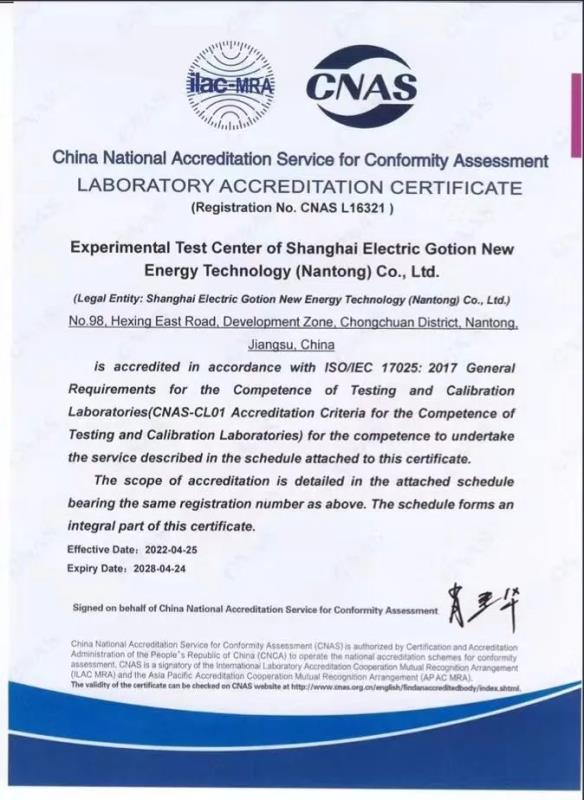 獲得認(rèn)可證書也是新的征程的開始,上海電氣國軒實(shí)驗(yàn)測(cè)試中心將持續(xù)秉承“準(zhǔn)確、及時(shí)、客觀、高效”的質(zhì)量方針,依據(jù)CNAS認(rèn)可的檢測(cè)流程與標(biāo)準(zhǔn),高效完成各項(xiàng)檢測(cè)工作,并積極拓展測(cè)試種類以滿足更多儲(chǔ)能產(chǎn)品研發(fā)檢測(cè)需求,推動(dòng)儲(chǔ)能行業(yè)的健康高效發(fā)展。