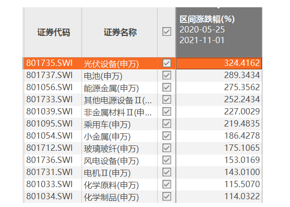 上圖是在大盤技術(shù)性回調(diào)前,申萬(wàn)一級(jí)行業(yè)板塊從2020年年中至2021年年底的區(qū)間行情,可見,電力設(shè)備獨(dú)占鰲頭,以186%的漲幅領(lǐng)跑;而根據(jù)申萬(wàn)二級(jí)行業(yè)中,光伏設(shè)備板塊的表現(xiàn)更是“皇冠上的明珠”,以320%左右的漲幅跑贏了近兩年的大熱門板塊鋰電池。