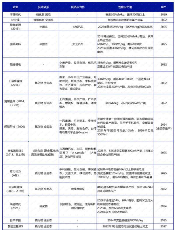 ● 國內(nèi)以鋰電巨頭和初創(chuàng)企業(yè)為主,參與者包括中科院化學(xué)所、中科院青島能源所、中科院寧波材料所等研究機(jī)構(gòu),贛鋒鋰業(yè)、寧德時(shí)代等電池企業(yè),一些汽車零部件廠商和新能源廠商也加快了進(jìn)入固態(tài)電池的跨界投資的步伐,比如萬向集團(tuán)、比亞迪等企業(yè)。