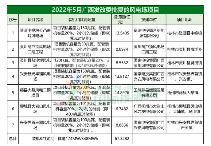 不止風(fēng)電儲(chǔ)能一體化項(xiàng)目,在廣西發(fā)改委批復(fù)的風(fēng)電場項(xiàng)目中,雖然項(xiàng)目名稱中沒有儲(chǔ)能二字,但是都提出了20%&2h的儲(chǔ)能配置要求。例如,5月剛過幾天已經(jīng)通過的風(fēng)電場項(xiàng)目: