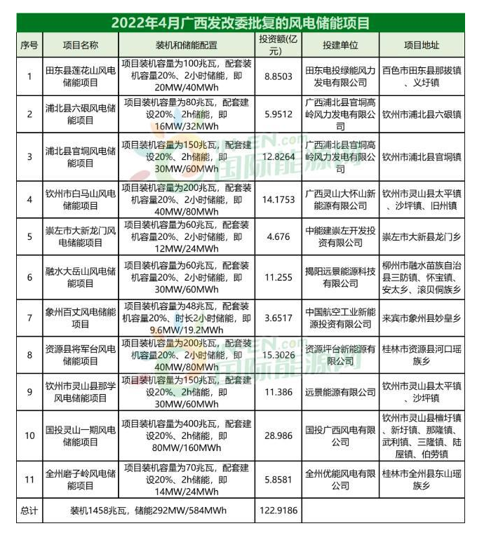 4月,廣西發(fā)改委批復(fù)11個(gè)風(fēng)儲(chǔ)一體化項(xiàng)目,儲(chǔ)能總規(guī)模達(dá)292MW/584MWh,投資總額超122億。項(xiàng)目開發(fā)商主要來自國家電投、中能建、遠(yuǎn)景能源等。具體內(nèi)容如下: