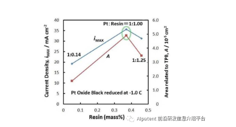 圖3. 在-1.0C電量下電化學還原后的Pt Oxide Black的氨氧化電流以及三相界面相關面積與催化層中陰離子交換樹脂含量的關系