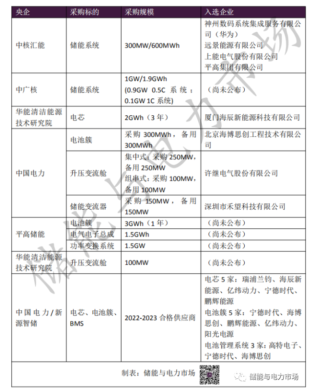 2022年以來央企儲能集采項目和入選企業(yè)