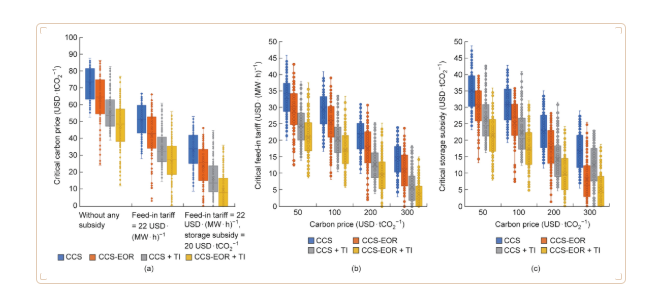圖3 不同情景下煤電開展CCUS技術(shù)所需激勵政策的臨界值。(a)臨界碳價格;(b)臨界電價補貼;(c)臨界埋存補貼。CCS:CO2捕集、運輸和咸水層埋存;CCS-EOR:CO2捕集、運輸和驅(qū)油利用埋存;TI:考慮CCUS的技術(shù)進(jìn)步。