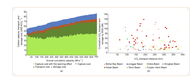 圖1 成本效益結(jié)果、電廠匹配的埋存盆地運輸距離和2050年CO2累計埋存量。(a)CO2捕集、運輸和埋存成本與年累積捕集量的對比。x軸表示年CO2累計埋存規(guī)模;y軸表示有/無技術(shù)改進(jìn)的CO2捕集成本、CO2管道運輸和埋存成本。(b)2050年CO2累計埋存量和輸送距離的關(guān)系。x軸表示CO2的平均輸送距離;y軸表示到2050年CO2累計運輸埋存量。