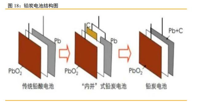 鉛碳電池是一種電容型鉛酸電池,是從傳統(tǒng)的鉛酸電池演進(jìn)出來(lái)的技術(shù)。普通鉛酸 電池的正極活性材料是氧化鉛(PbO2),負(fù)極活性材料是鉛(Pb),若把負(fù)極活性材料Pb全部 換成活性炭,則普通鉛酸電池變成混合電容器;若把活性炭混合到負(fù)極活性材料Pb中, 則普通鉛酸電池變成鉛炭電池。