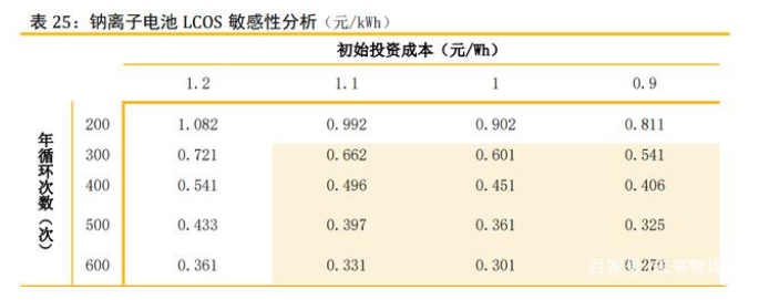 由于產(chǎn)業(yè)尚未應(yīng)用,我們假設(shè)在相對(duì)成熟階段,在初始投資成本1.1元/Wh,年均循 環(huán)次數(shù)300次,壽命為10年, LOCS為0.661元/kWh,與磷酸鐵鋰電池相當(dāng)。