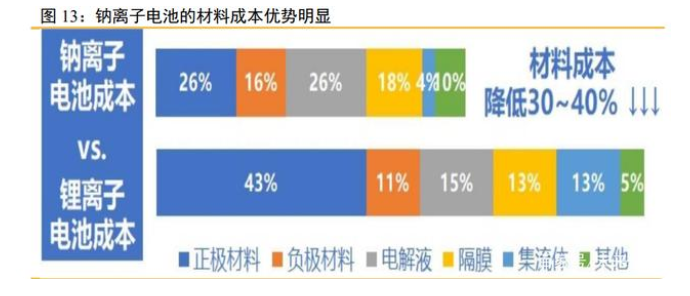 鈉離子電池性能優(yōu)異,被寄予厚望。決定電化學(xué)儲(chǔ)能能否被大面積應(yīng)用的關(guān)鍵因素 包括安全性、材料資源可得性、高低溫性能、壽命、投資成本等,而根據(jù)鈉離子電池最 新研究進(jìn)展,它在這些方面都表現(xiàn)出了良好的性能。在規(guī)模化應(yīng)用后成本有望低于鐵鋰 電池,可在大規(guī)模電化學(xué)儲(chǔ)能、低速電動(dòng)車(chē)等領(lǐng)域得到廣闊應(yīng)用,有望與鋰離子電池形 成互補(bǔ)和有效替代。
