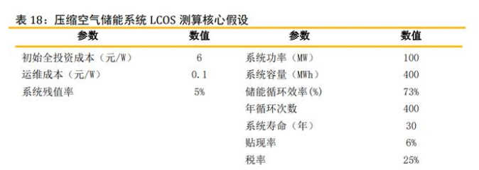 壓縮空氣儲(chǔ)能全壽命儲(chǔ)能度電成本(LCOS)測(cè)算核心假設(shè): 1)初始投資成本:綜合多種文獻(xiàn),壓縮空氣初始投資成本在 6-7.5 元/瓦之間, 100MW 級(jí)別的成本預(yù)計(jì)可以達(dá)到 6000 元/kW 以下。我們假設(shè) 100MW/400MWh 的項(xiàng)目單位投 資成本為 6 元/W。 2)年度運(yùn)維成本假設(shè):壓縮空氣儲(chǔ)能所需的維修保養(yǎng)成本相對(duì)較高,每年需要2%左 右。我們假設(shè)運(yùn)維成本為0.1元/W。 3)系統(tǒng)壽命假設(shè):壓縮空氣產(chǎn)能電站的主體設(shè)施可以使用30-50年,我們這里保守 預(yù)測(cè)30年的運(yùn)營(yíng)壽命。 4)循環(huán)效率:壓縮空氣儲(chǔ)能系統(tǒng)的能量利用效率近年來(lái)快速上升,大容量電站效率 已經(jīng)可以達(dá)到70%,先進(jìn)儲(chǔ)能項(xiàng)目可以達(dá)到75%。5)循環(huán)次數(shù):電站一般可以每天全容量沖放1-2次,對(duì)應(yīng)年循環(huán)次數(shù)350-700次,循 環(huán)次數(shù)越高,系統(tǒng)度電成本越低。 6)貼現(xiàn)率:考慮到當(dāng)前央企能源企業(yè)的融資成本在4-5%,我們選取6%作為折現(xiàn)率。