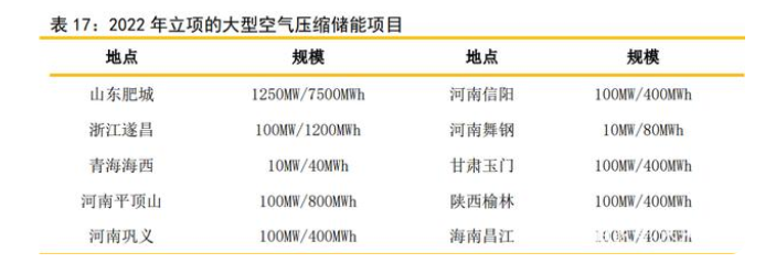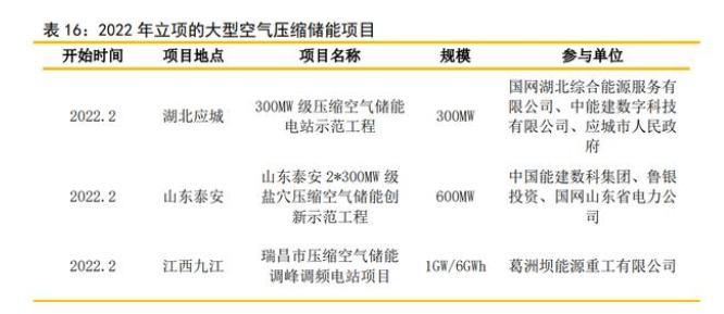 2022年以來(lái)大功率項(xiàng)目開(kāi)始快速上馬。2022年2月,湖北應(yīng)城300MW(兆瓦)級(jí)壓縮 空氣儲(chǔ)能電站示范項(xiàng)目簽約活動(dòng);山東省泰安市推進(jìn)開(kāi)發(fā)600MW(20MW)級(jí)鹽穴壓縮空氣 儲(chǔ)能電站;葛洲壩能源重工有限公司擬位于瑞昌市投資約80億元,建設(shè)規(guī)模為 1000MW/6000MWh的壓縮空氣項(xiàng)目。
