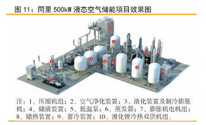 壓縮空氣系統(tǒng)構(gòu)成。壓縮空氣主要由壓縮系統(tǒng)、膨脹系統(tǒng)、發(fā)電及以及儲(chǔ)氣罐四大 核心部分。根據(jù)同里500kW液態(tài)空氣儲(chǔ)能項(xiàng)目效果圖,目前先進(jìn)的液態(tài)空氣儲(chǔ)能主要涉 及設(shè)備包括:1)壓縮機(jī)組,2)空氣凈化裝置,3)液化裝置及制冷膨脹機(jī),4)儲(chǔ)液裝置,5)低溫泵,6)膨脹劑電機(jī)組,7)膨脹機(jī)電機(jī)組,8)儲(chǔ)熱裝置,9)蓄冷裝置,10) 溴化鋰?yán)錈犭p供機(jī)組。