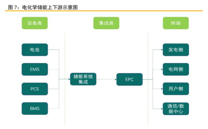 鋰離子儲(chǔ)能產(chǎn)業(yè)鏈由上游設(shè)備商,中游集成商和下游終端用戶組成。其中設(shè)備包括 電池、EMS(能量管理系統(tǒng))、BMS(電池管理系統(tǒng))、PCS(變流器);集成商包括儲(chǔ)能 系統(tǒng)集成和EPC;終端用戶則由發(fā)電側(cè)、電網(wǎng)側(cè)、用戶側(cè)以及通信/數(shù)據(jù)中心組成。