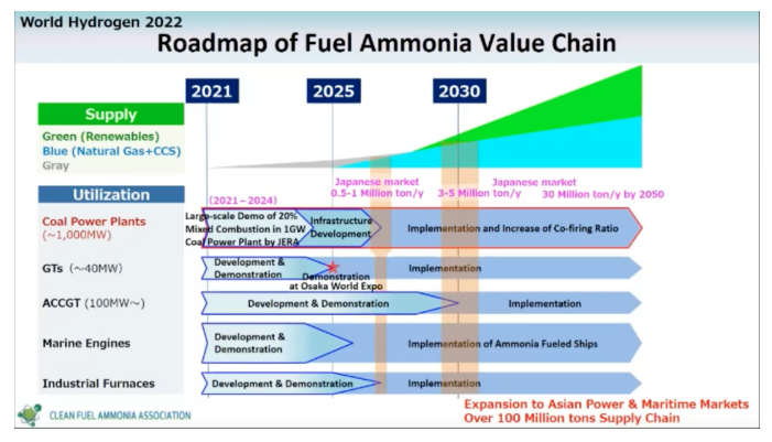 日本最大的發(fā)電商JERA率先制定了2050碳排放近零的路線(xiàn)圖,預(yù)計(jì)在2024年實(shí)現(xiàn)20%氨和燃煤的混合燃燒,在2050年實(shí)現(xiàn)100%的氨燃燒。為實(shí)現(xiàn)這一燃料來(lái)源的轉(zhuǎn)換,JERA計(jì)劃從2027年開(kāi)始每年將購(gòu)買(mǎi)多達(dá)50萬(wàn)噸的氨,用作燃煤電廠(chǎng)的燃料,目前已向全球 30 多家公司發(fā)出提案請(qǐng)求,尋求未來(lái)采購(gòu)氨的長(zhǎng)期合作關(guān)系。