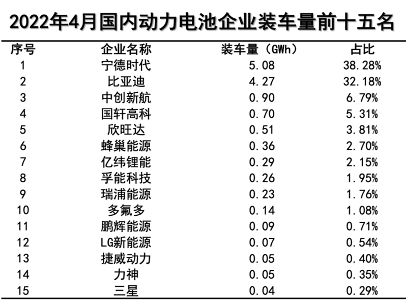 4月份國(guó)內(nèi)動(dòng)力電池裝機(jī)量TOP15的企業(yè)分別是:寧德時(shí)代、比亞迪、中創(chuàng)新航、國(guó)軒高科、欣旺達(dá)、蜂巢能源、億緯鋰能、孚能科技、瑞浦能源、多氟多、鵬輝能源、LG新能源、捷威動(dòng)力、力神、三星。