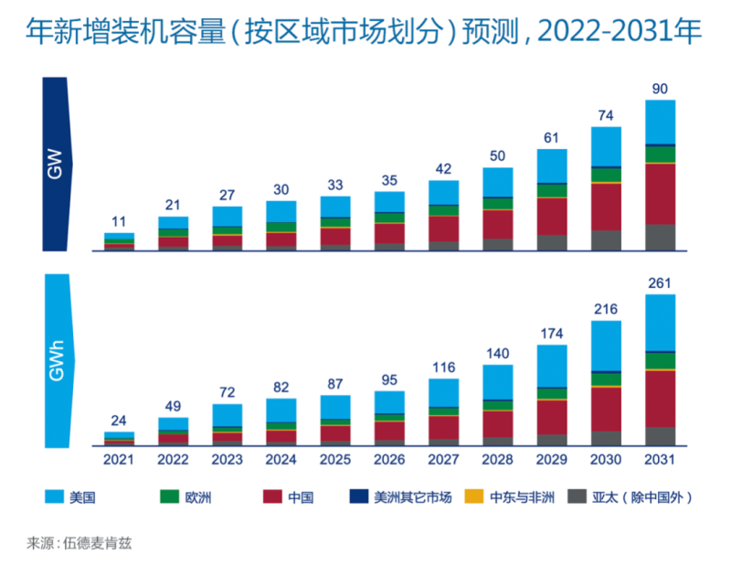 隨著電池組成本繼續(xù)下降、可再生能源滲透率的提高,以及對儲能等靈活性資源的需求增加,預計未來十年,全球儲能市場的累計新增裝機容量將擴大近九倍,實現(xiàn)460GW/1,292GWh。